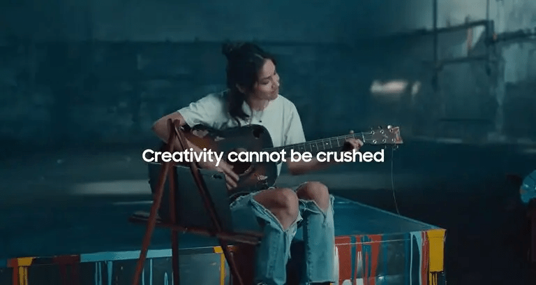 “Criatividade não pode ser esmagada” é a frase que estampa o fim do comercial. Nele a Samsung decidiu reconstruir o cenário do comercial da Apple onde tudo era esmagado, destruído e comprimido num Ipad. Entre os destroços e manchas de tinta entra uma garota que resgata um violão em mau estado e começa a tocá-lo. Para ler uma partitura ela utiliza o novo tablet da Samsung.