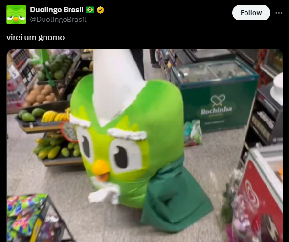 O que o Duolingo fez foi aproveitar esse vídeo e fazer sua própria versão não muito tempo depois, gerando muito engajamento por se tratar de uma marca fazendo a trend e fazendo muitos reagirem com risadas nos comentários. Além de acertar mais uma vez no tom do humor, a corujinha verde viu a oportunidade e aproveitou para gerar engajamento.