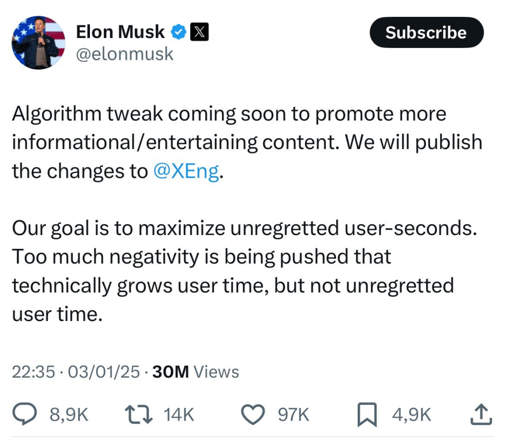 Essa pode ser uma das primeiras mudanças que aconteceu sob a direção de Elon Musk que não foi completamente criticada pelos usuários. Num Tweet ele afirma que o X vai passar a promover mais conteúdos que sejam divertidos ou informativo para aumentar o tempo de uso no qual o usuário não se arrepende de usar a rede social.